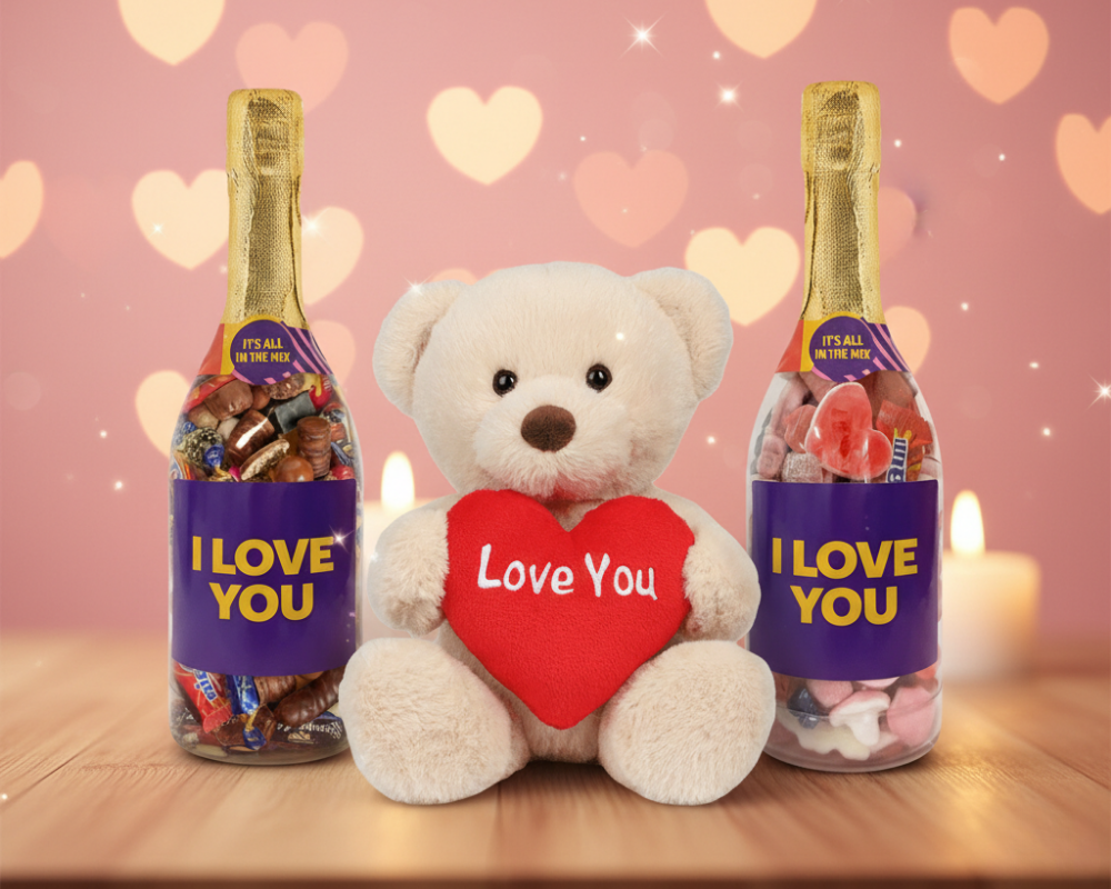 Vores I Love You-champagneflaske er fyldt med lækkert slik og pakket ind i et romantisk udtryk, der passer perfekt til Valentinsdag. En gave, der både overrasker, forkæler og får smilet frem – uden at du behøver sige ret meget mere.