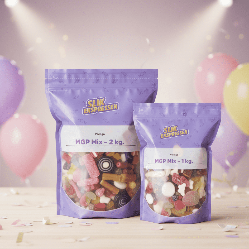 Vores 1 kg MGP Mix og 2 kg MGP Mix er fyldt med farverigt og festklart slik, der passer perfekt til en aften med glitter, grin og gode sange.