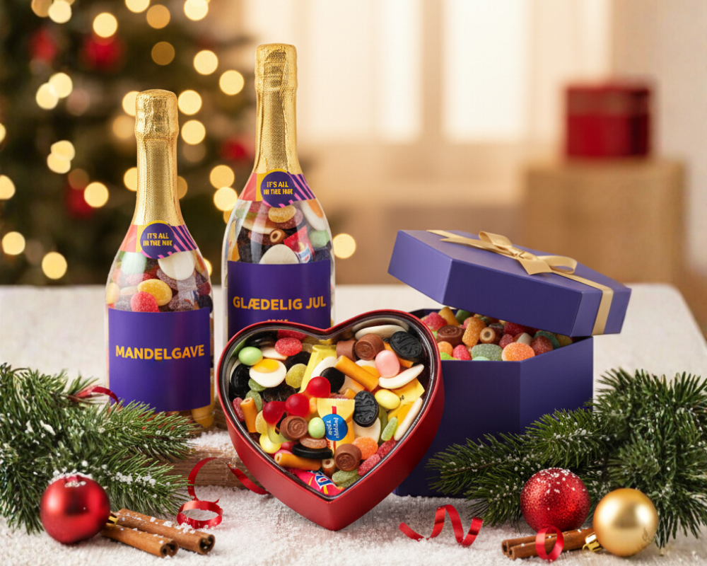 Den sødeste og mest velsmagende mandelgave finder du også her – fyldt med farverigt Bland Selv Slik, der gør juleaften ekstra hyggelig for den heldige vinder.