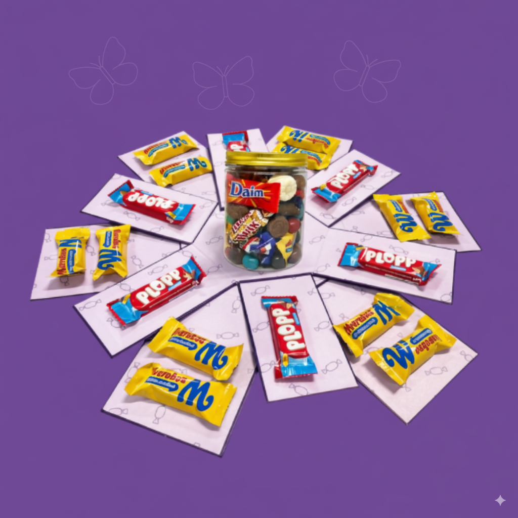 Vores nye Explosion Box er en oplevelse i sig selv. Når låget løftes, folder boksen sig ud i flere lag fyldt med slik og små overraskelser. Du vælger selv indholdet – fra chokolade og lakrids til kærlige detaljer.